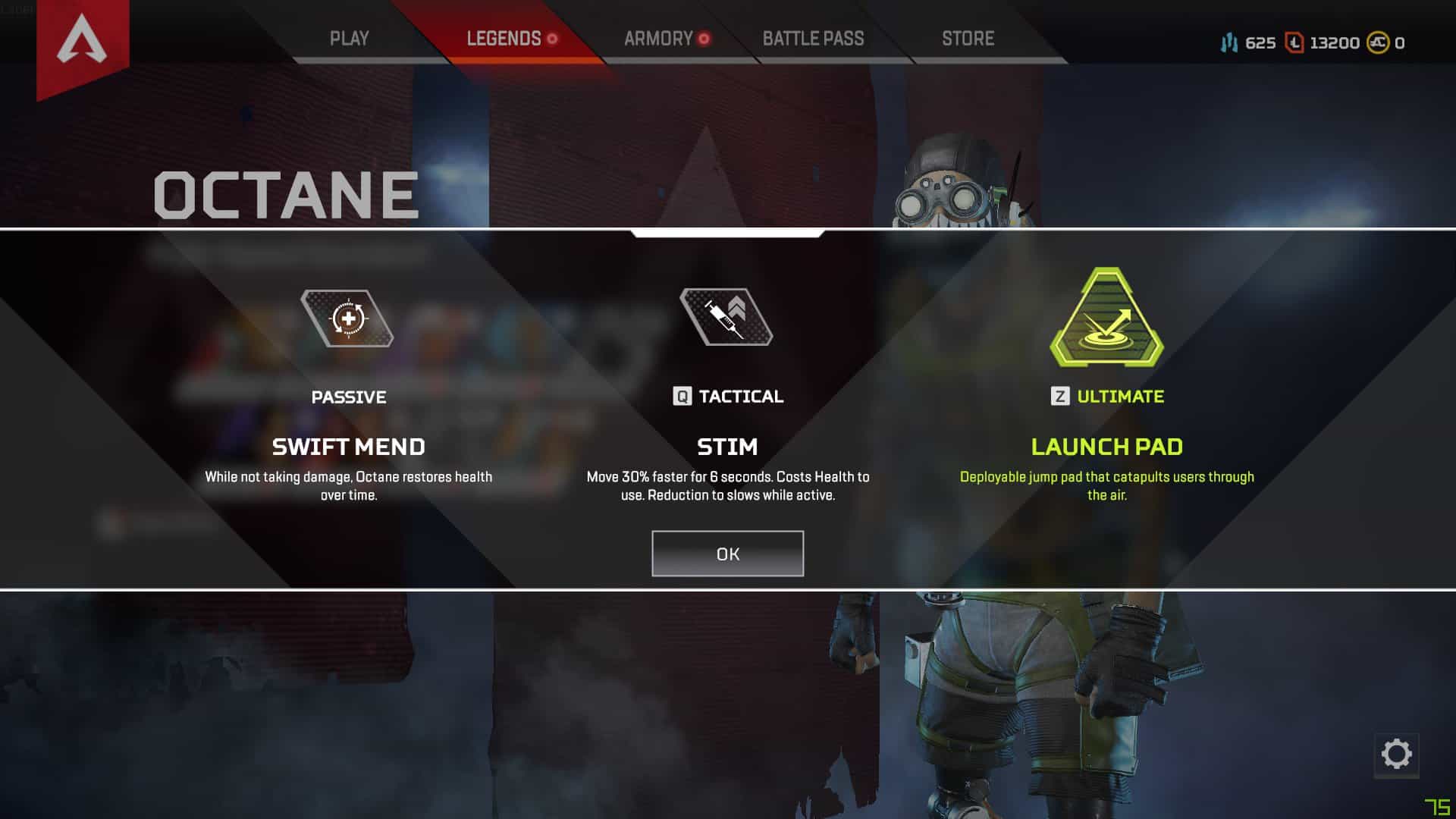- Tactical ability – Stim: Octane’s tactical ability is a speed enhancement drug that lets him move 30% faster for 6 seconds at the cost of some health. Interestingly, the cooldown for Octane’s tactical ability is only 2 seconds.