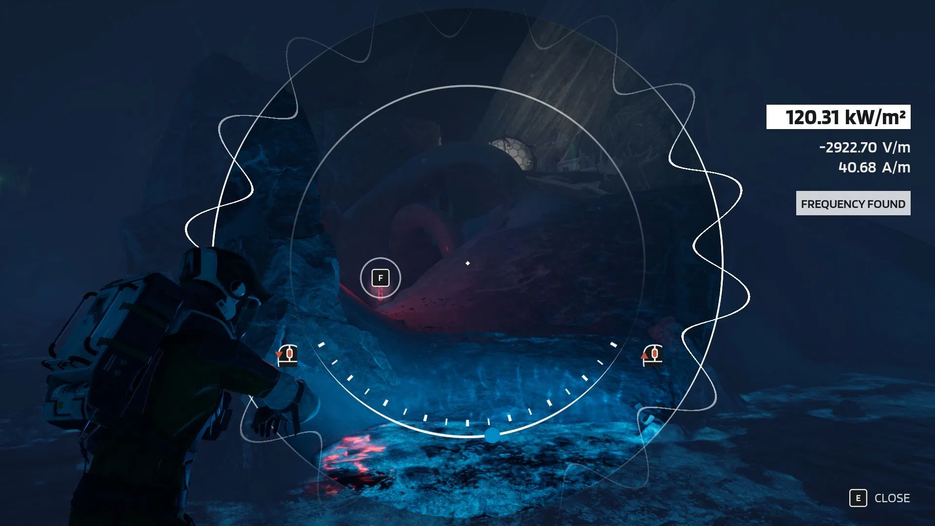Step 1: Return to the source and turn around. Use the EM scanner to find the ice formation behind you and tune its frequency to open the path.