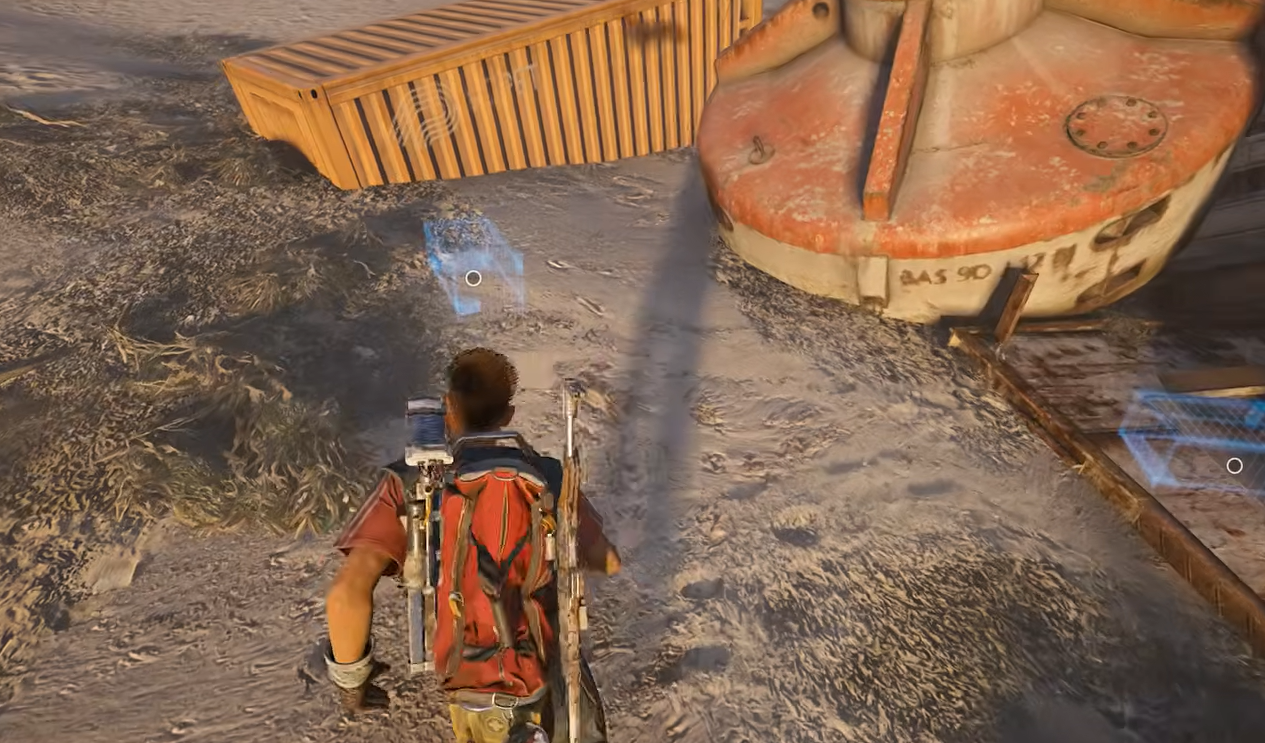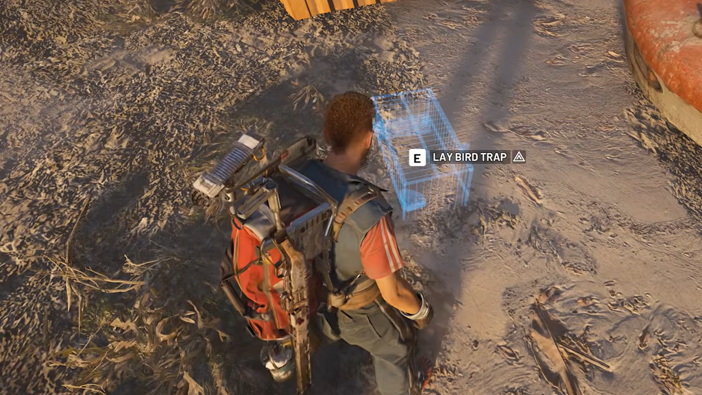 Step 3: Approach the large red buoy sticking out of the sand. A blue cage hologram and a "Lay Bird Trap" prompt will appear. Press the interact key (E on PC) on any of the valid spots around the buoy.