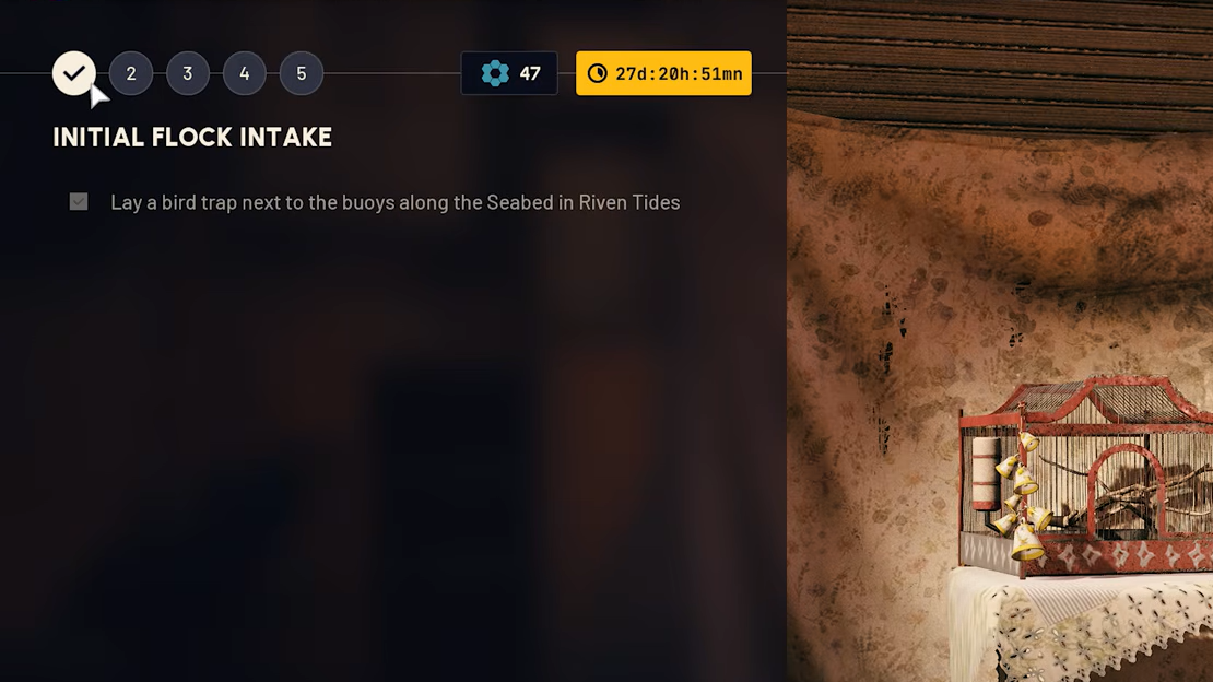 | 1. Initial Flock Intake | Place bird trap by the buoy on Riven Tides | Dockmaster's Detector, 25 Raider Tokens |