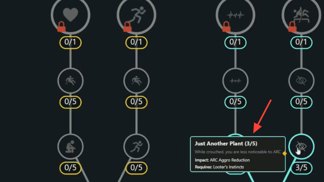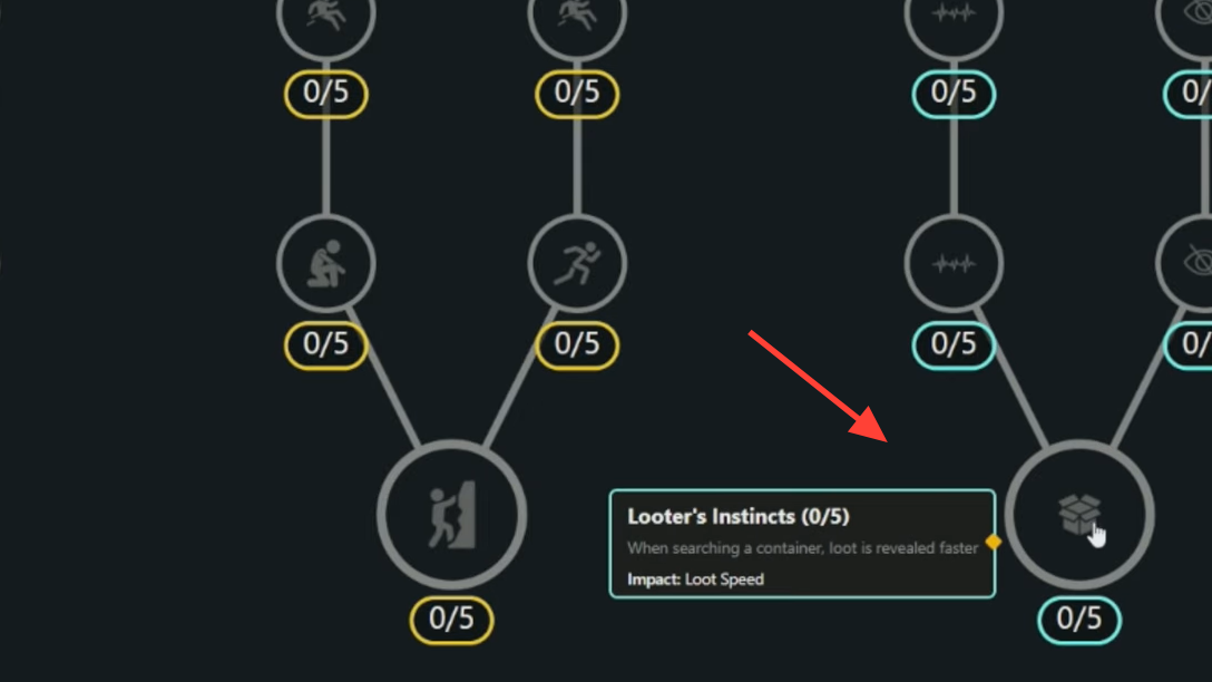 - Points 21–25: Choose based on playstyle — Survival (Silent Scavenger, Looter’s Instincts) for safer looting, or Mobility (Agile Croucher) for quieter relocations.