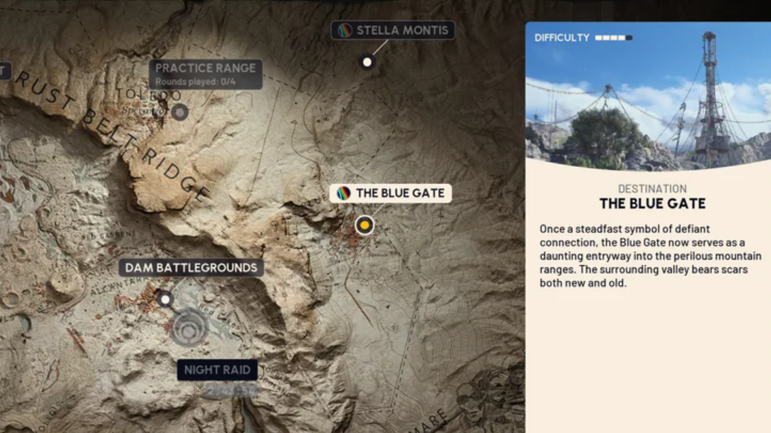 Blue Gate is a high-altitude region with open terrain, small settlements, tunnel networks, and underground facilities. It’s one of the Rust Belt locations where raids play out and where tunnel access—and therefore keys—matter. On the map select screen, Blue Gate is listed with short descriptive text, and Stella Montis appears there as well. Stella Montis has been hinted at, but access and details remain unspecified. Treat it as a potential destination rather than an immediate objective.