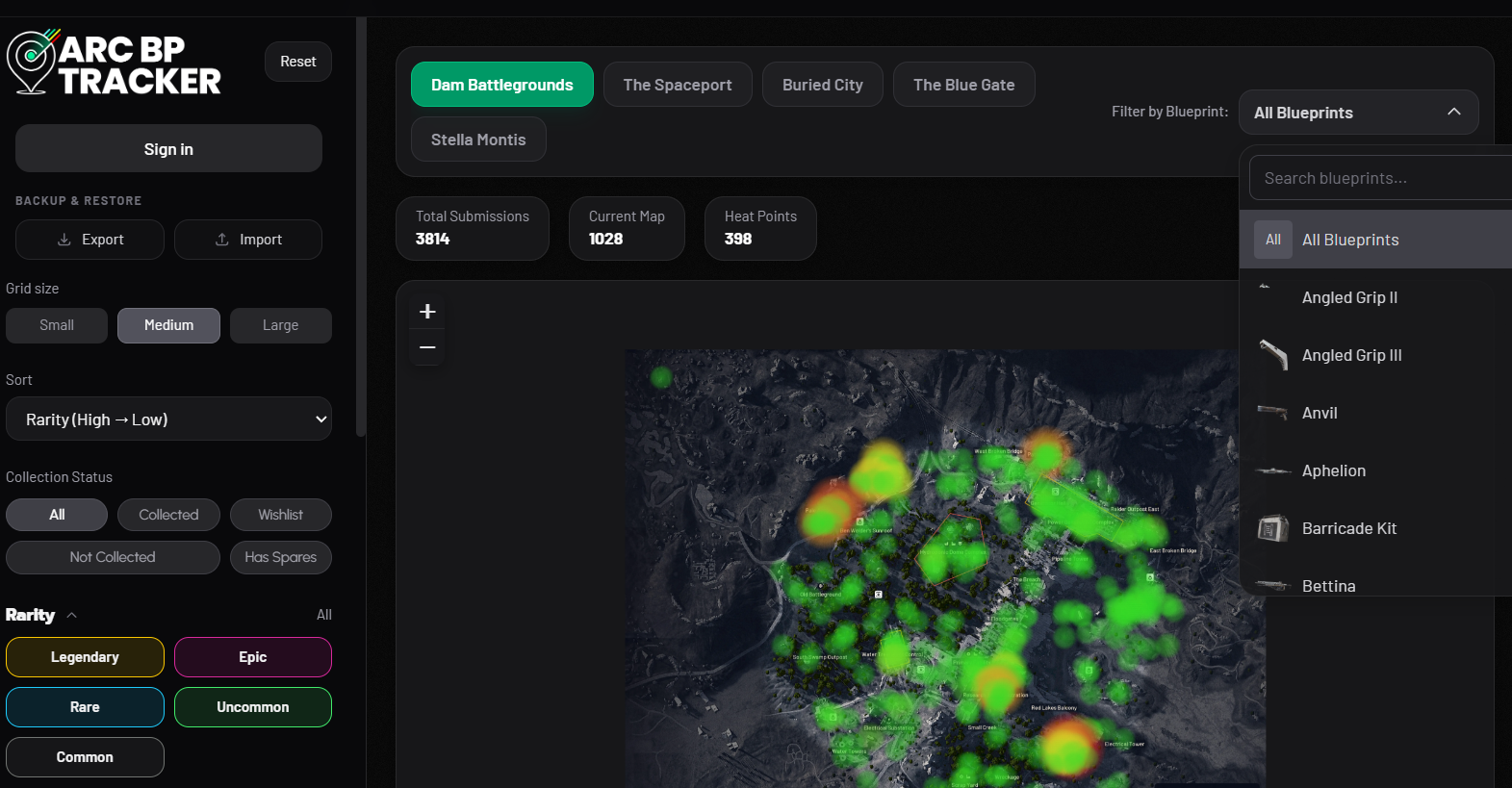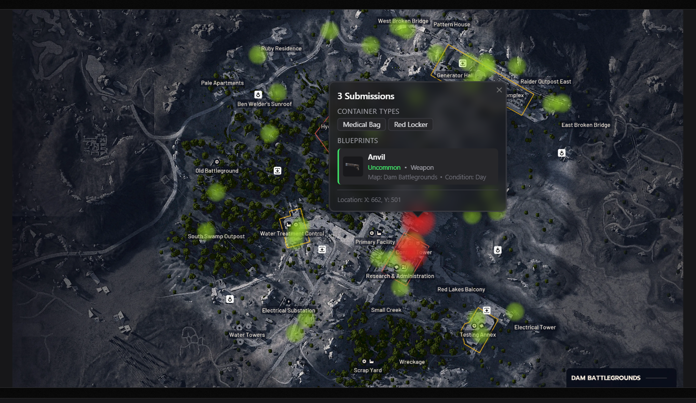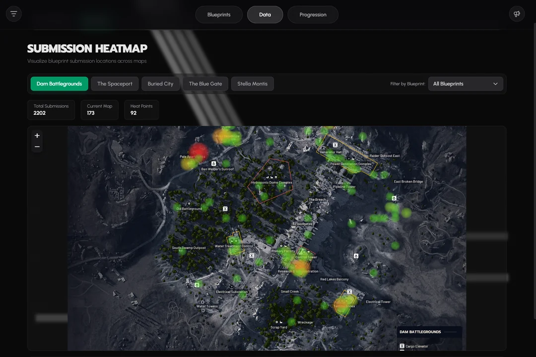 The heat map layer on ArcBlueprintTracker plots individual player submissions — each one recording a blueprint name, the map it was found on, the specific location within that map, and the container type it came from. When enough reports cluster in the same area, the overlay shifts from green (low density) through yellow (medium) to red (high density). The site currently holds nearly 3,800 total submissions spread across all five maps: Dam Battlegrounds, The Spaceport, Buried City, The Blue Gate, and Stella Montis.