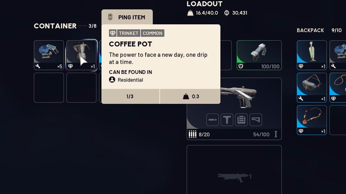 Step 3: Equip an Augment that unlocks a Safe Pocket slot, then move any Coffee Pots you find into that Safe Pocket as soon as you pick them up. If you die on the way out, the Safe Pocket preserves the item.