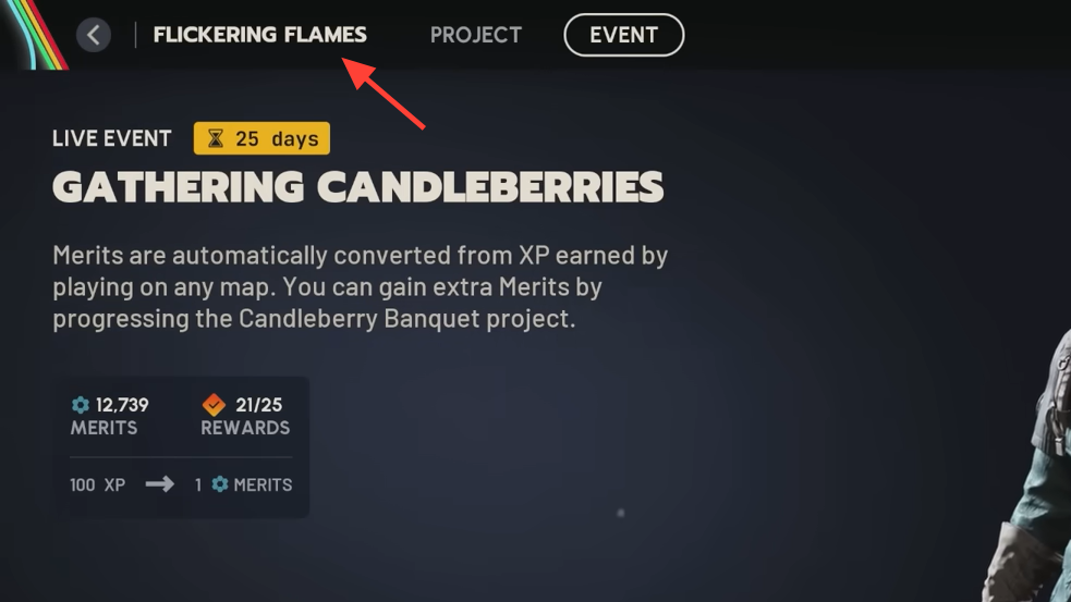 Step 2: In Speranza, open the Cold Snap event interface and navigate to the Flickering Flames project track.