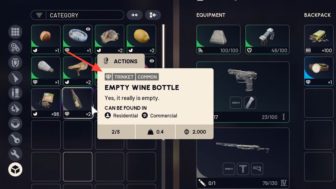Trinkets — the items marked with a small diamond — are the most reliable money makers. Prioritize stackable trinkets with good single‑slot value over one‑off rares that eat a slot for only a small gain. Always secure your most valuable stack in a Safe Pocket when you have one.