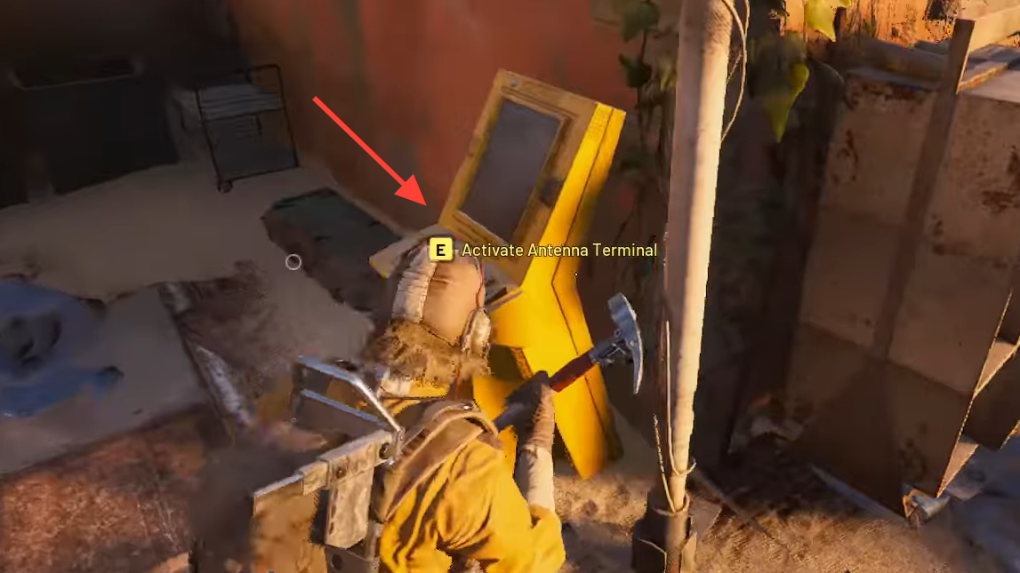 Step 5: Boot the antenna terminal inside the Red Tower. From the generator, move right and climb through the open window to reach the stairwell. Go through the broken wall on the right, climb the ladder to the roof, then head right again to a yellow control box around the corner. Interact to activate the antenna terminal and complete the quest.