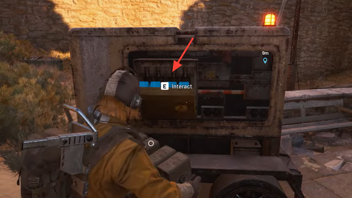 Step 3: Carry the battery to the generator’s open panel and install it. The generator is within the same courtyard, close to where you found the bag, so the carry distance is minimal.
