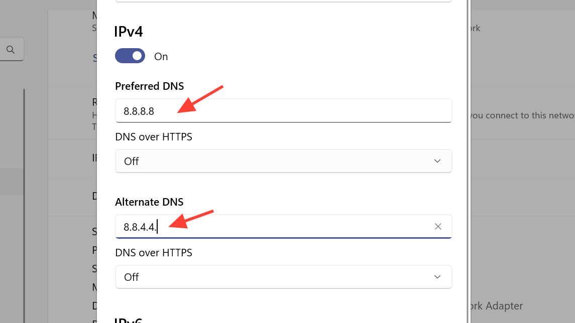 Step 2: Manually set the IPv4 DNS servers to one of the pairs in the table above.