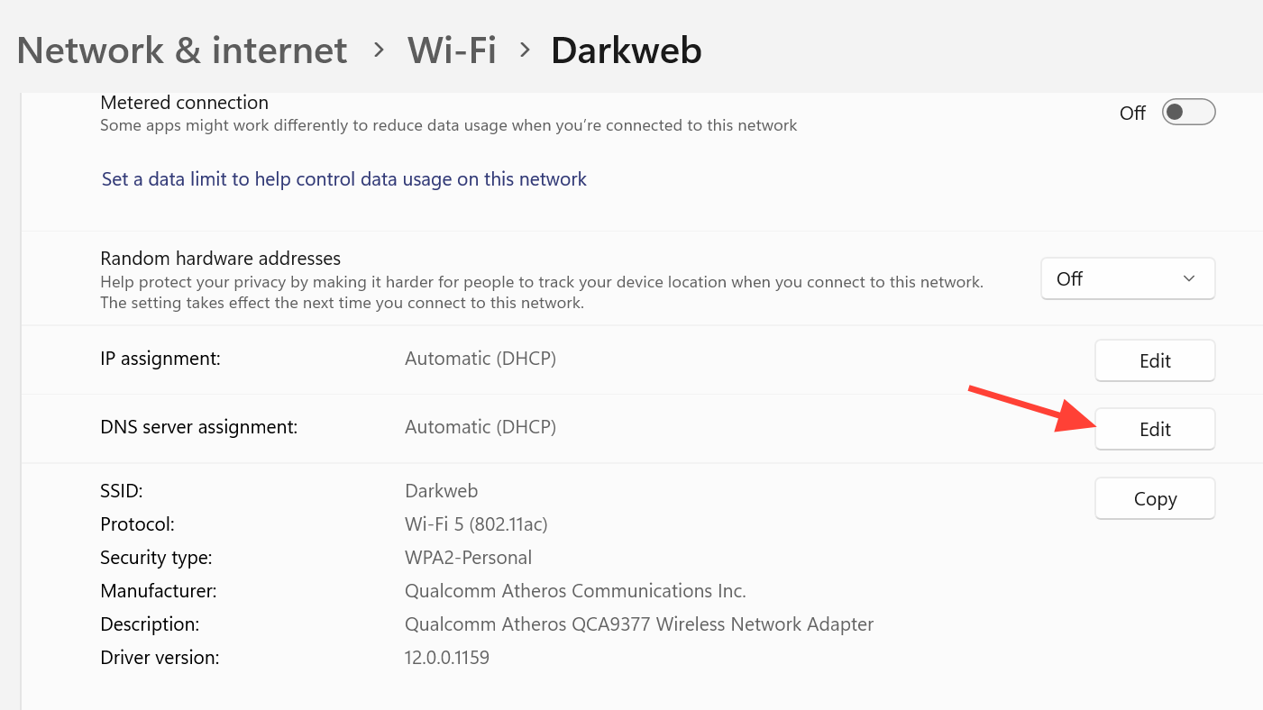 Step 1: Open Windows settings for your active network adapter and locate the DNS configuration.