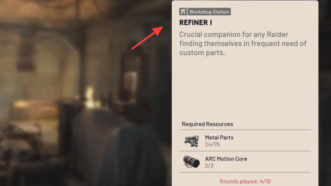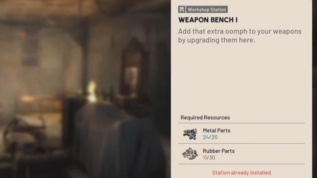The Refiner turns common materials into scarce components. A key early recipe converts 5 Metal Parts into 1 Mechanical Component, smoothing out the mid-game spike when bench and weapon upgrades suddenly demand mechanicals, mod parts, and electrical components.