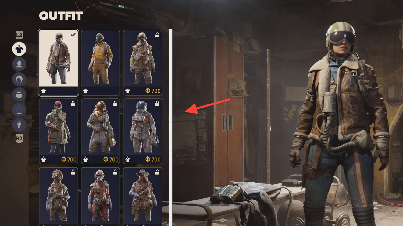 Outfits are equipped as complete sets rather than individual garments. You’re not slotting separate jackets, pants, and boots; you’re selecting a full look that sets your Raider’s silhouette in one step. Within those sets, visual refinements are available: color options and per‑outfit detail toggles let you adjust things like accessories or coverings. Backpacks and small attachments are handled as their own cosmetic items, so your utility profile still reads clearly even with set‑based clothing.
