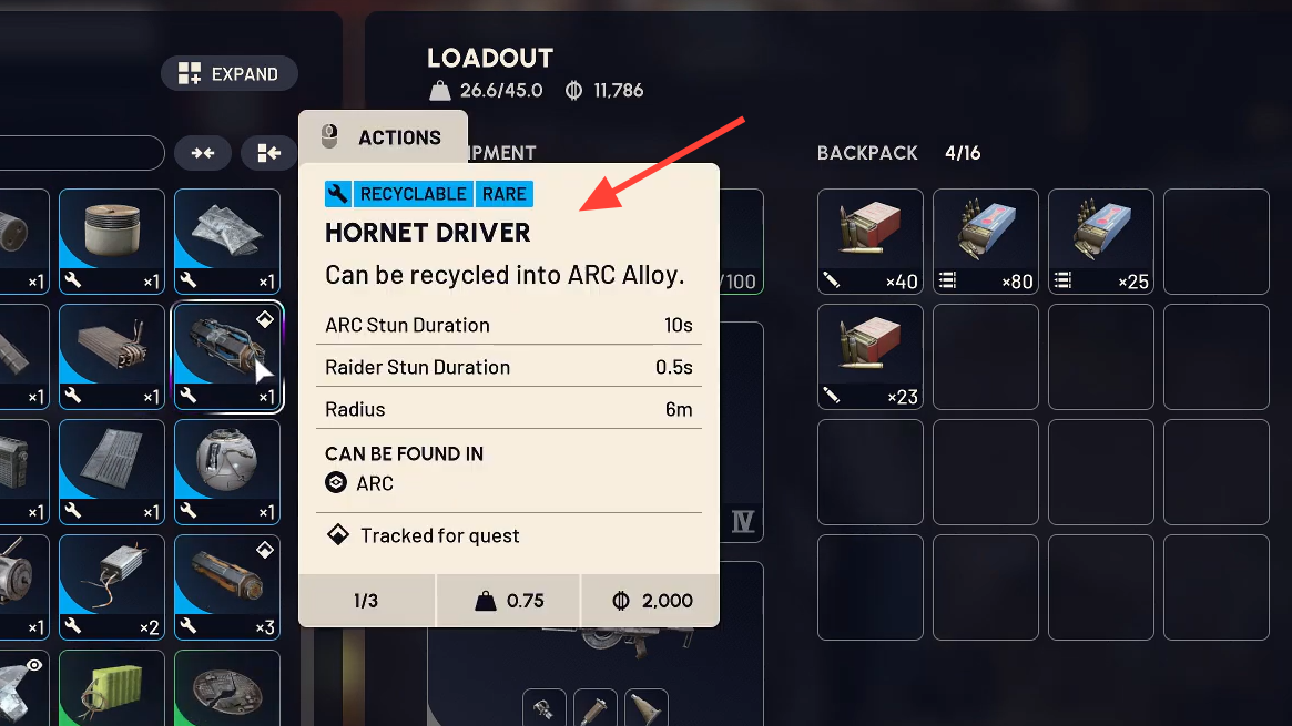 - Hornet: yields ARC Alloy, ARC Powercell, Hornet Driver, and medium ammo.