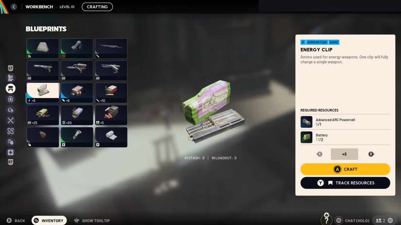 Step 4: Select Energy Clip and confirm the craft. One recipe use converts the input materials into a stack of five Energy Clips. Repeat as long as you have enough Batteries and Advanced ARC Powercells and enough inventory or stash capacity to hold the ammo.