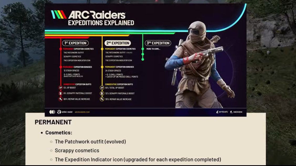 Permanent rewards stick to your account forever, even if you skip future Expeditions. The three consecutive buffs (XP, Scrappy materials, repair value) stack up to three times across consecutive departures but reset to zero if you skip one.