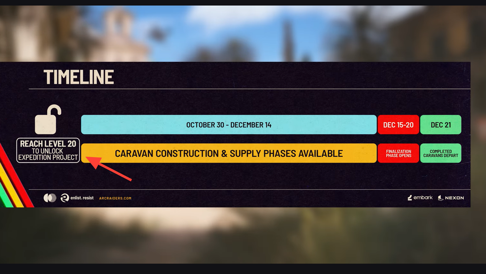 Reach level 20 to access Projects, then select the Expedition Project. You’ll prepare a caravan in stages by turning in items and resources over time. Materials contributed to the Project are committed.