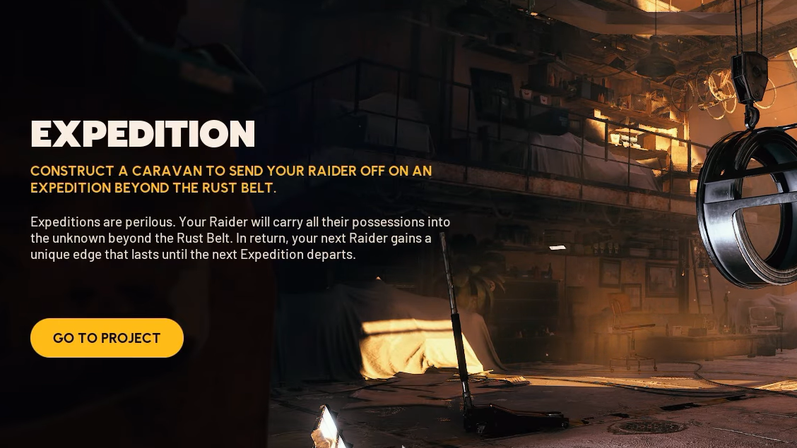 Expeditions are long‑term “Projects” you unlock at level 20 under the Projects tab on the Raider screen. The fiction is simple: you build a caravan, load it with supplies, and send your Raider off beyond the Rust Belt for good.