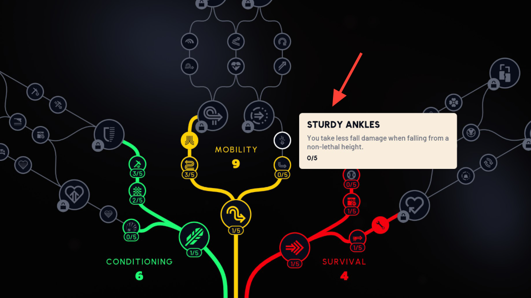 | Sturdy Ankles (Mobility) | Increases fall damage resistance from non‑lethal drops | Invest points; five levels scale the reduction | No effect on lethal falls |