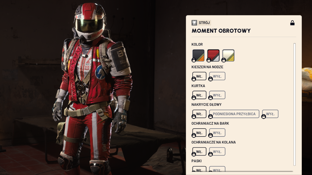 - Red and white variant. This version carries the most visible racing references. It includes detailed decals, sponsor‑style graphics, and stronger color contrast across the torso and sleeves.