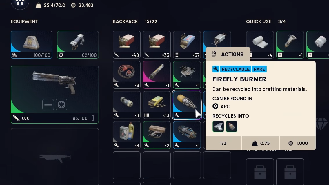 The Firefly Burner is classified as a rare, recyclable material with a weight of 0.75 and a sell value of 1,000 coins. Its primary purpose is completing the Weather Monitor System project, but it also serves as a crafting ingredient. Combined with one Synthesized Fuel and two Crude Explosives at an Explosives Station 3 (plus the Trailblazer Blueprint), it produces a Trailblazer. If you don't need it for crafting or the project, recycling a Firefly Burner yields two ARC Alloy and two Crude Explosives. Salvaging returns two Crude Explosives.