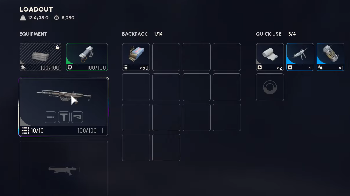 The kit is intentionally weaker than a typical custom setup. You’ll have limited ammo and healing, a smaller inventory capacity, and no way to protect a guaranteed item via Safe Pocket if you die.