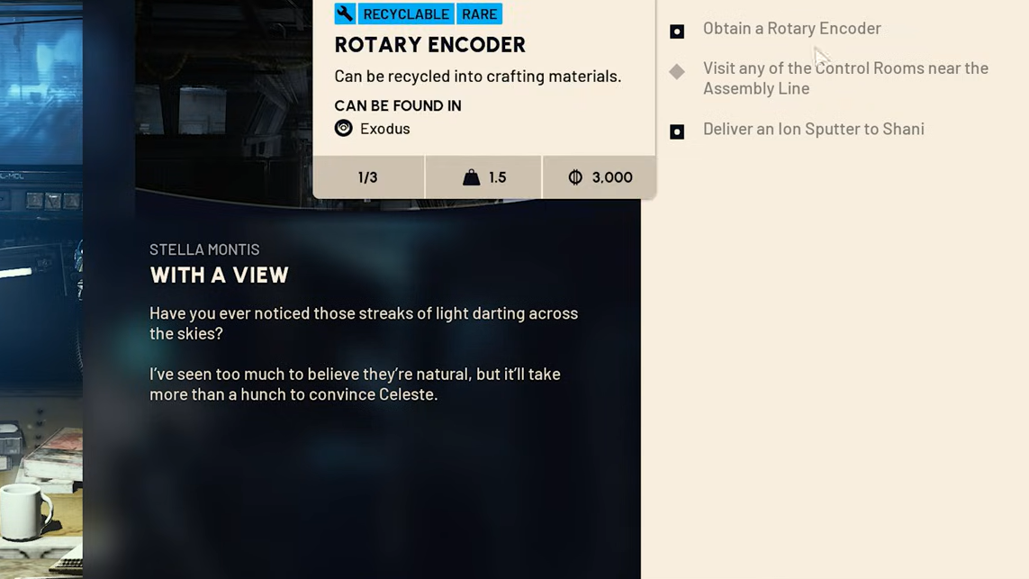 Quick answer: Loot a Rotary Encoder from Exodus containers on Stella Montis, use it on a yellow server switch in any Assembly control room and interact with the nearby computer, then extract with an Ion Sputter and hand it to Shani to finish the quest.