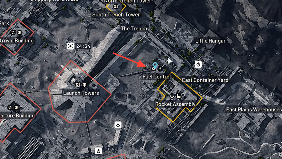 The first half of the quest focuses on Spaceport’s Fuel Control Building. This structure sits close to the center–northeast of the map, in the same cluster of infrastructure as Rocket Assembly and the Launch Towers. Multiple descriptions place it either slightly east of the central Launch Towers or on the northeastern side next to Rocket Assembly; in both cases, you are looking for the Fuel Control Building label on the map.