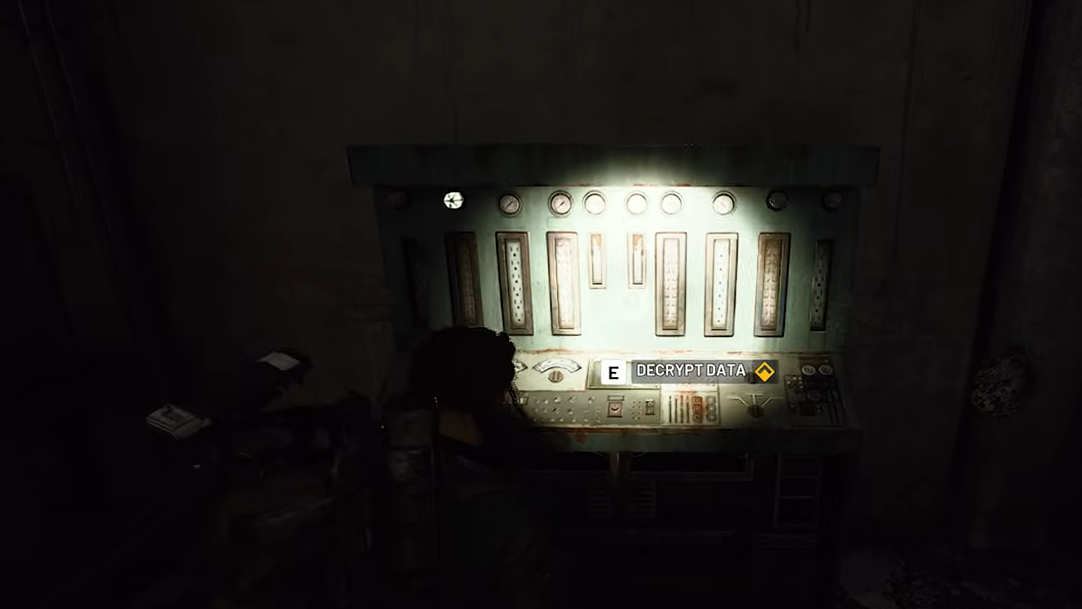 Step 2: Go inside and walk straight through the main room. Expect low lighting and rows of consoles and equipment on either side. Keep your flashlight on to make the lone interactive panel easier to spot.
