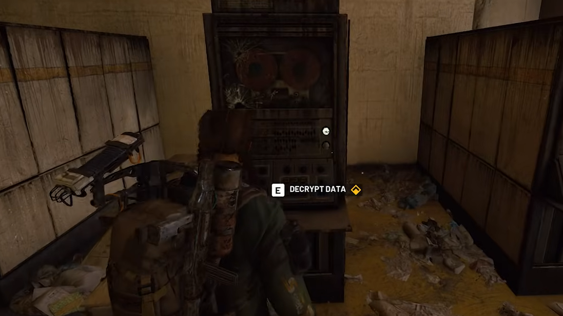 Step 3: At the far end of the hall, look along the wall for a distinctive terminal you can interact with. Different descriptions mention this console as green or standing alone on a wall in a large console-filled room. When you are close, you receive a prompt to use the Magnetic Decryptor or decrypt the data.