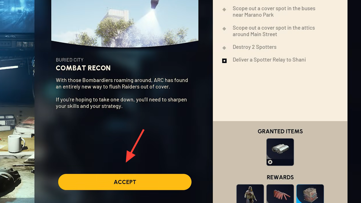 The Combat Recon quest in ARC Raiders sends you to Buried City to scout three cover spots, destroy two Spotters, then extract a Spotter Relay for Shani. You can complete the objectives across multiple raids, so there’s no pressure to do everything in one run.