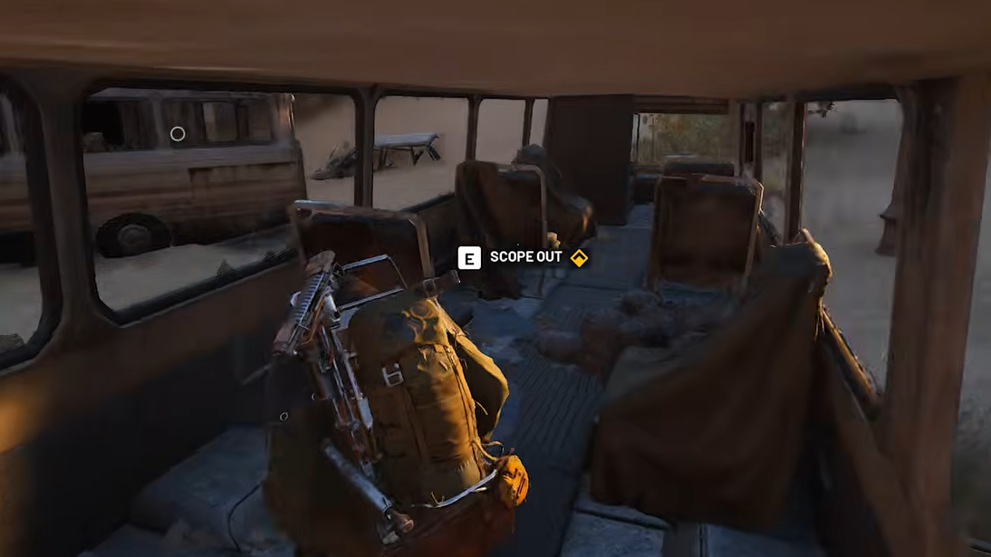 Enter one of the buses closest to the building by the extract. Inside, stand near the marked white circle until the interaction appears, then trigger the “Scope out” prompt. Any bus with the prompt active counts, so you only need to scan one to clear this objective.