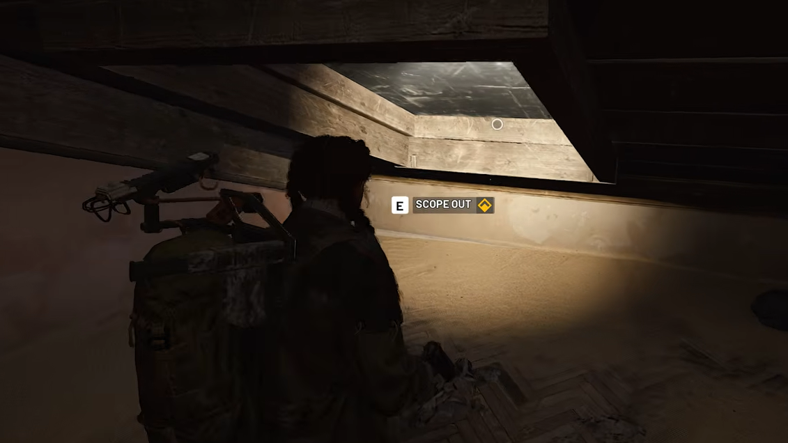 Enter the building from ground level or drop in from the roof. Inside, use the internal zipline or stairs to climb into the attic level. Look for an open attic window or hatch overlooking Main Street; at this window, you’ll see the familiar white circle. Interact to “Scope out” and the recon portion of Combat Recon is done.