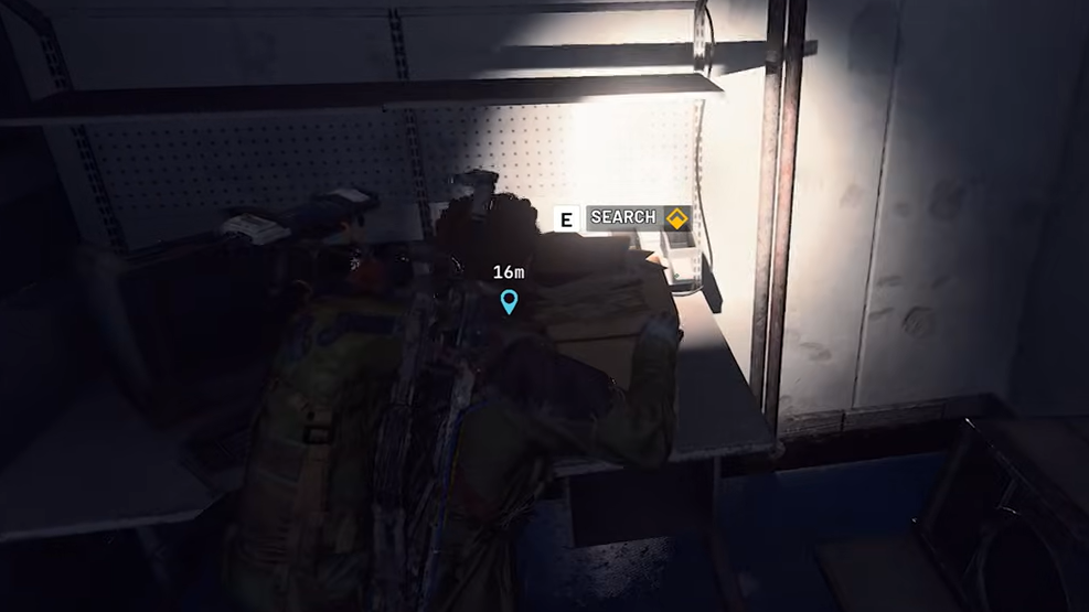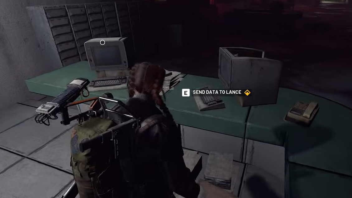 The quest completion item is physical: either a box you can search or envelopes on a desk. Use the interaction prompt on this container to pick up the printed shipping logs.