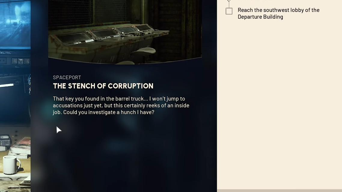 Handled in that order, The Stench of Corruption becomes a short, predictable run across the western side of Spaceport: building, locker room, tunnels, terminal, then back to Shani to collect the Warden outfit.