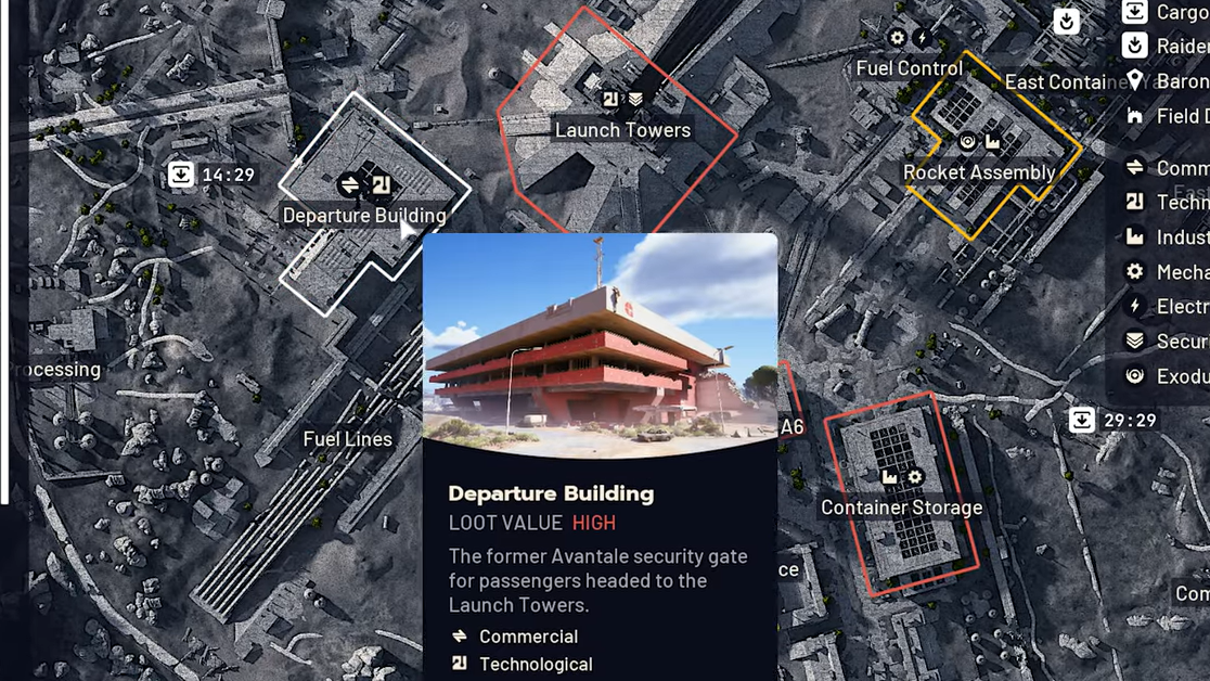 The entire first phase happens in the Departure Building on the Spaceport map. The building sits on the western side of Spaceport, to the left of the central Launch Towers and below the Arrival Building. It is also a popular high-value loot zone, so expect other Raiders nearby.