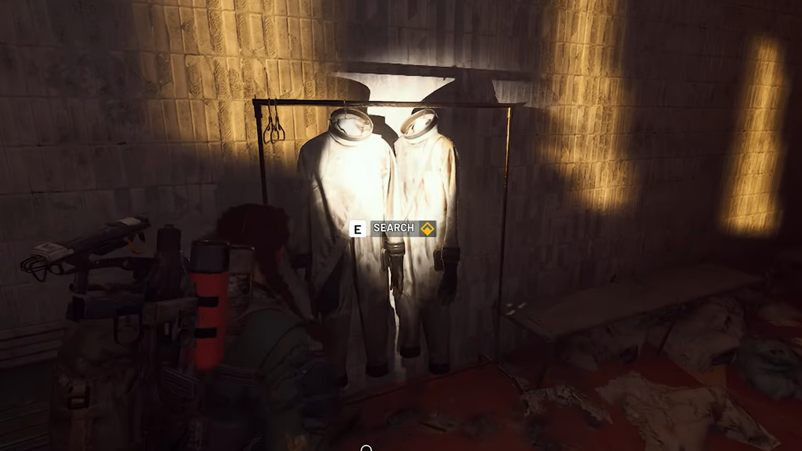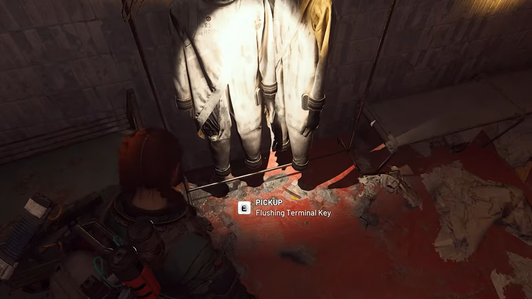 Step 2: Approach these hanging suits until you see the interaction prompt appear. Interact with the suits to reveal the Flushing Terminal Key, which drops to be picked up like a normal item.