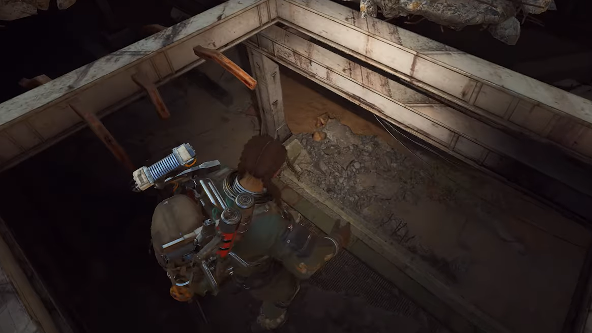 Step 2: Drop through this ground opening to enter the tunnel level beneath Spaceport. When your character reaches the tunnel floor, the objective to reach the tunnels is marked complete, and the quest updates to the terminal step.