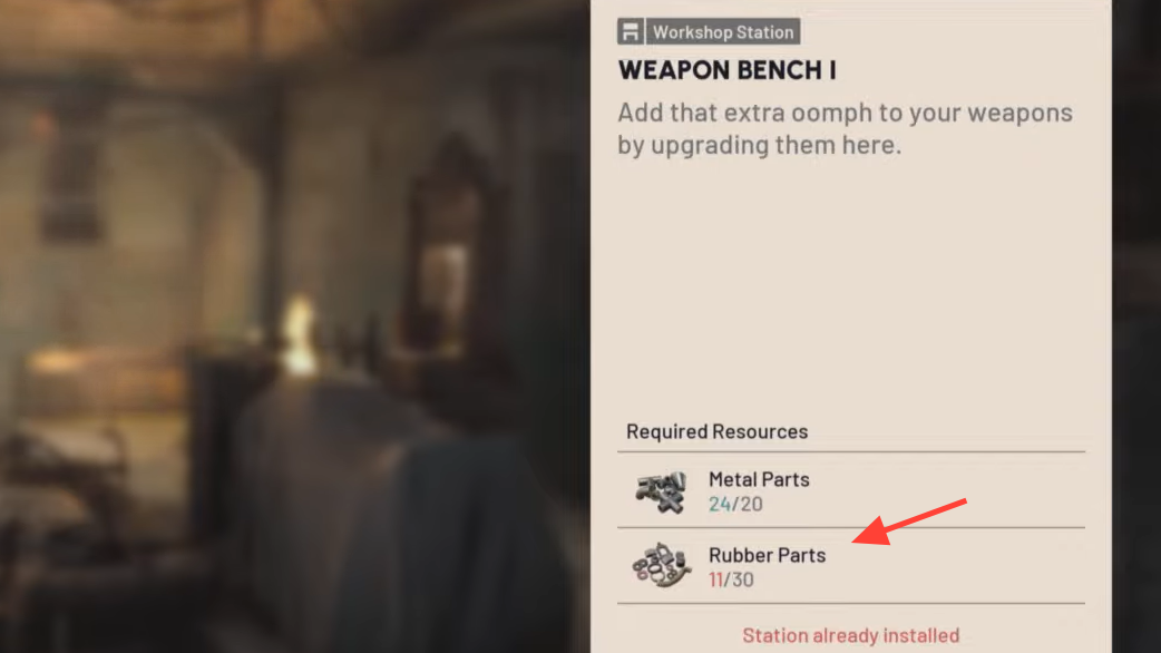 | 1 | 20× Metal Parts, 30× Rubber Parts | Weapon crafting basics (station access) |