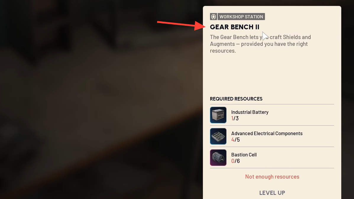 | Gear Bench upgrade | 3× Industrial Battery, 5× Advanced Electrical Components, 6× Bastion Cell | Gear Bench 2 | Gear Bench 3 |