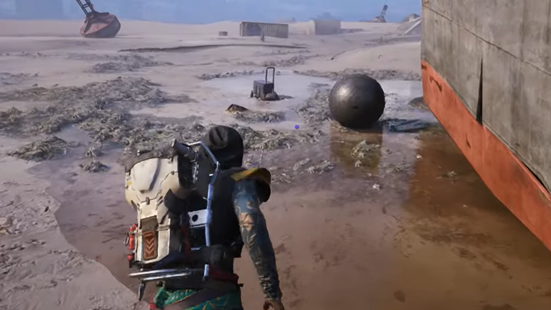 You are looking for a single, large beached buoy lying on the sand. It is rusted, bell-shaped, and stands out clearly against the flat landscape. Some players see it as orange, others as red, depending on the lighting, but there is only one, and it is hard to miss once you are on the seabed.
