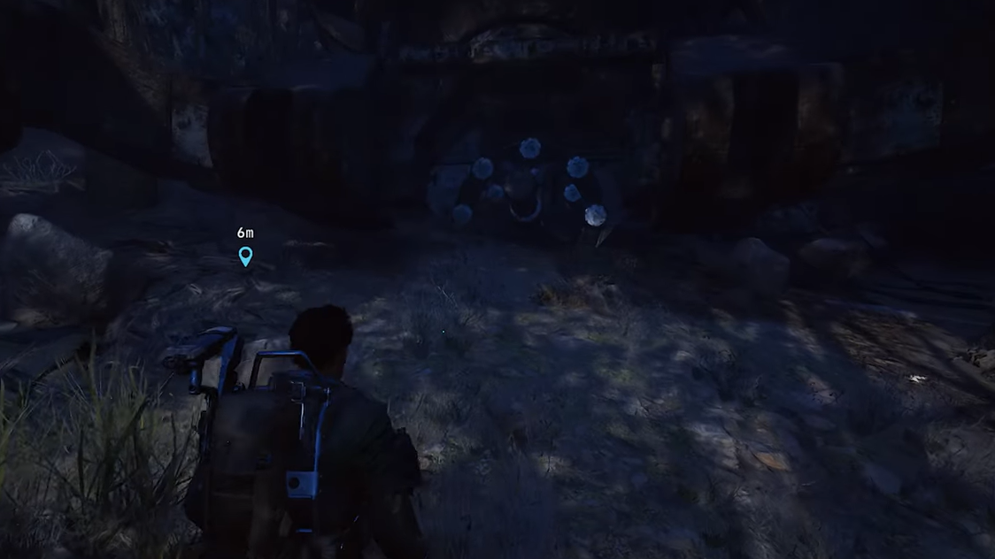 Step 1: Stand facing the Baron Husk wreckage in the Formicai Hills clearing. From this position, turn slightly to the right-hand side of the husk.