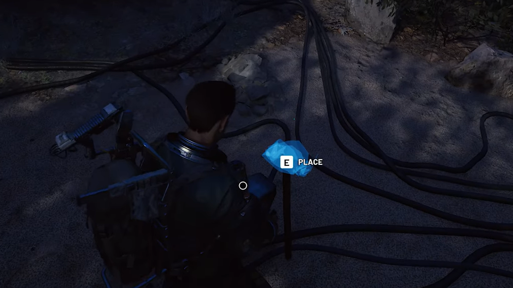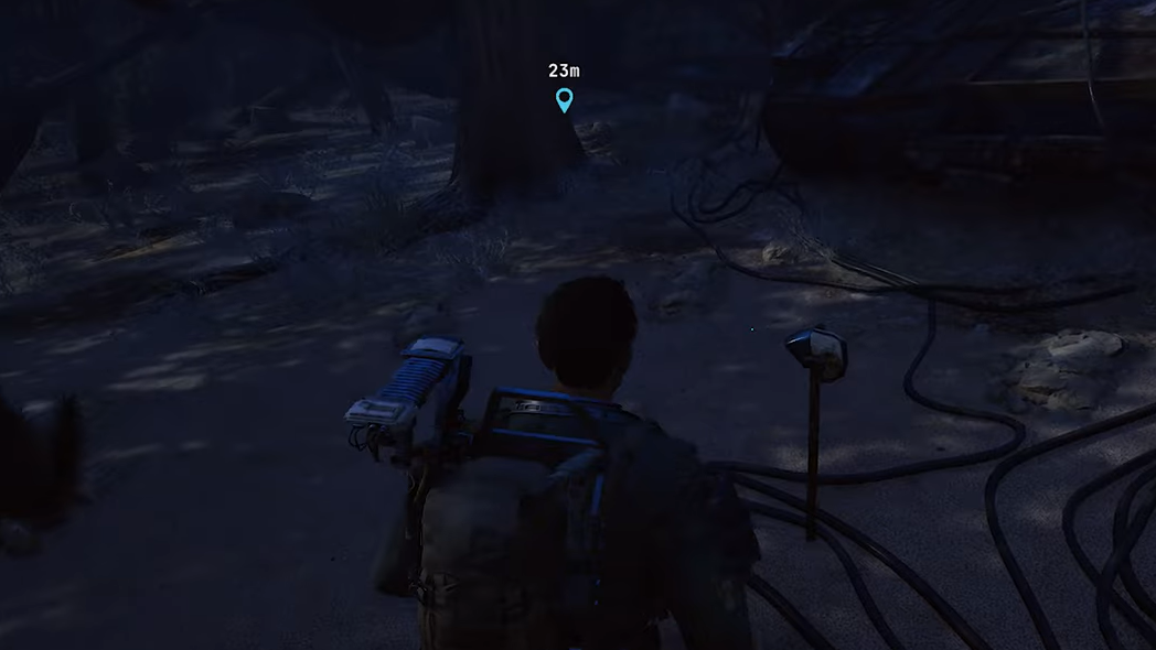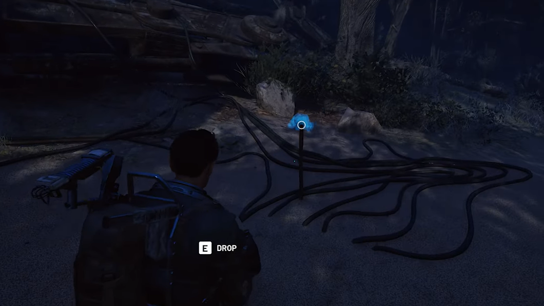 Step 1: From the helmet bush, walk a little further into the clearing while still carrying the helmet. Look for a slim memorial pole protruding from the ground near some wires or cabling.