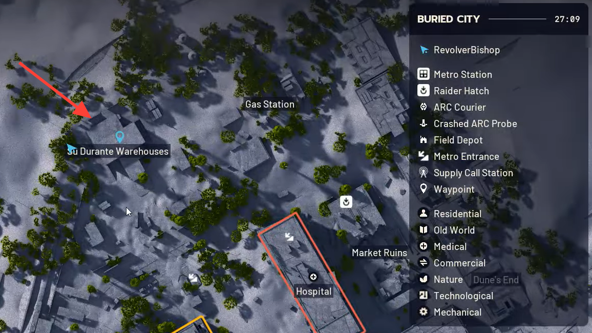 Head to the Su Durante Warehouses on the edge of Buried City. Players often confuse a single “warehouse” marker with the actual cluster — you want the multi-building Warehouses on the outskirts.