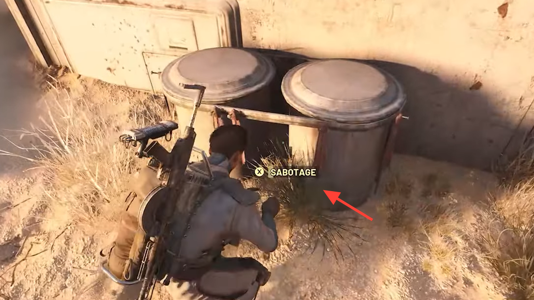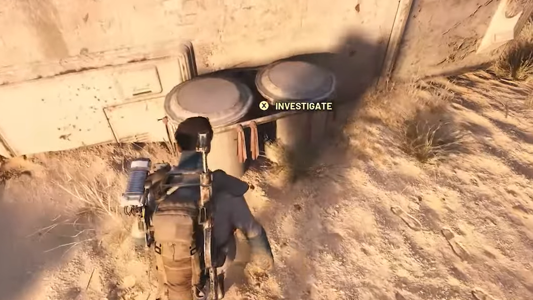 From ground level, you’ll see a compact metal or prefab structure at the far end of the station area. Walk around to its western face and look along the wall for the double canisters. They sit very close to each other and will trigger an interaction prompt when you get close enough.
