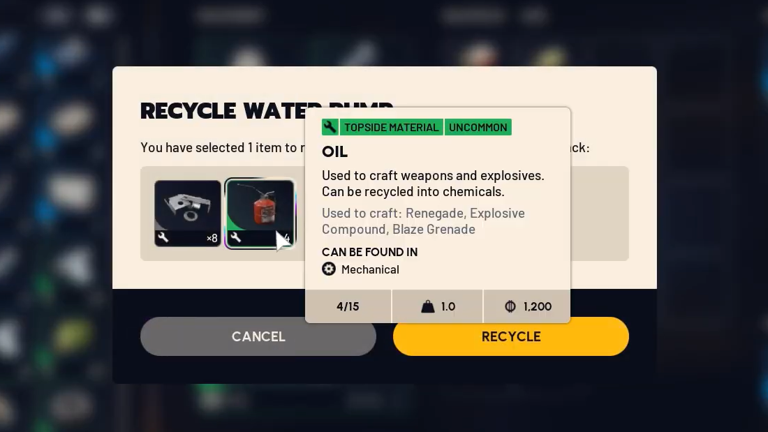 On top of that, recycling or salvaging Oil gives Chemicals, so it is also a way to top up that crafting material when needed. Recycling Oil returns three Chemicals, while salvaging returns one.