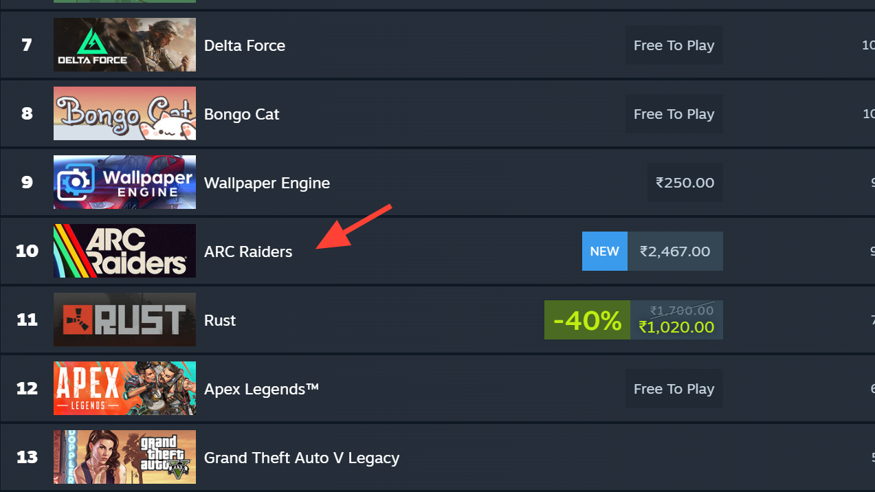 - Search for “Arc Raiders” to see the live player estimate and how it ranks among top Steam games.