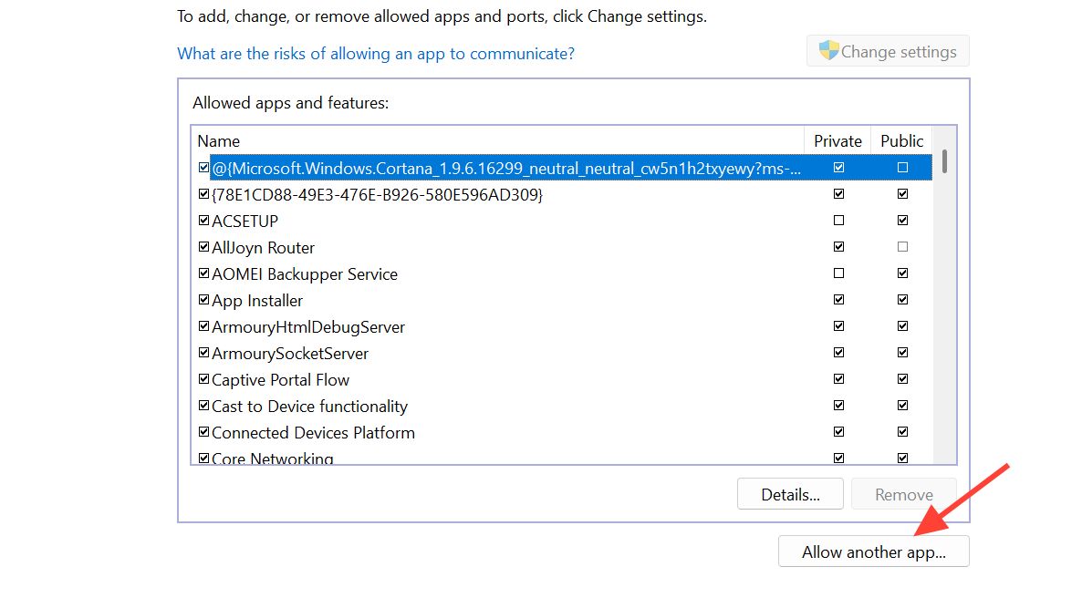 - If the game is missing from the list, use “Allow another app” and browse to the installation folder to add