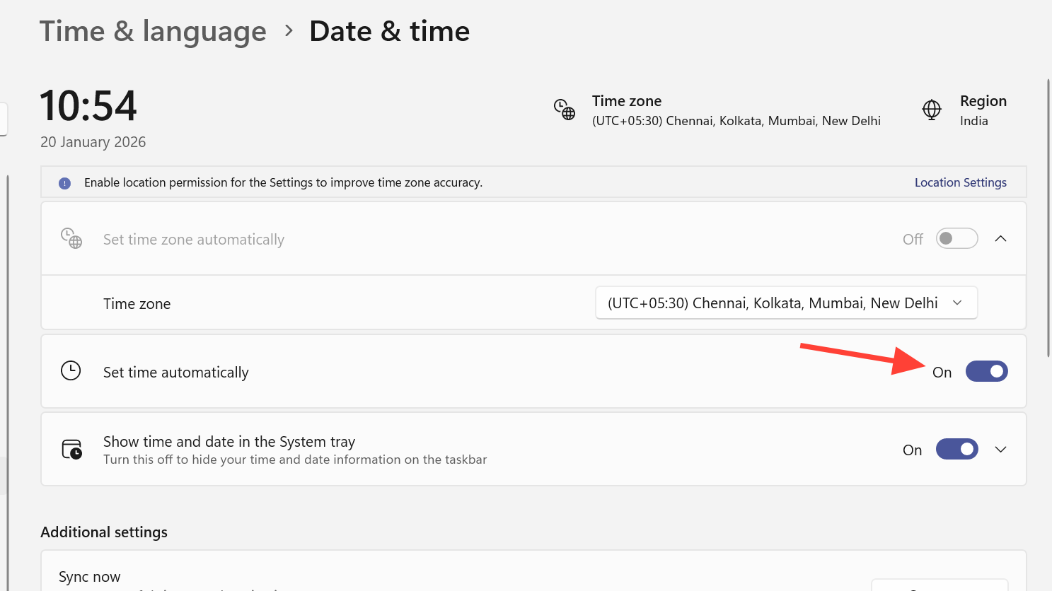 Step 1: Open Windows Settings and go to Time & Language > Date & time. Turn Set time automatically and Set time zone automatically on, wait a few seconds, then launch ARC Raiders again.