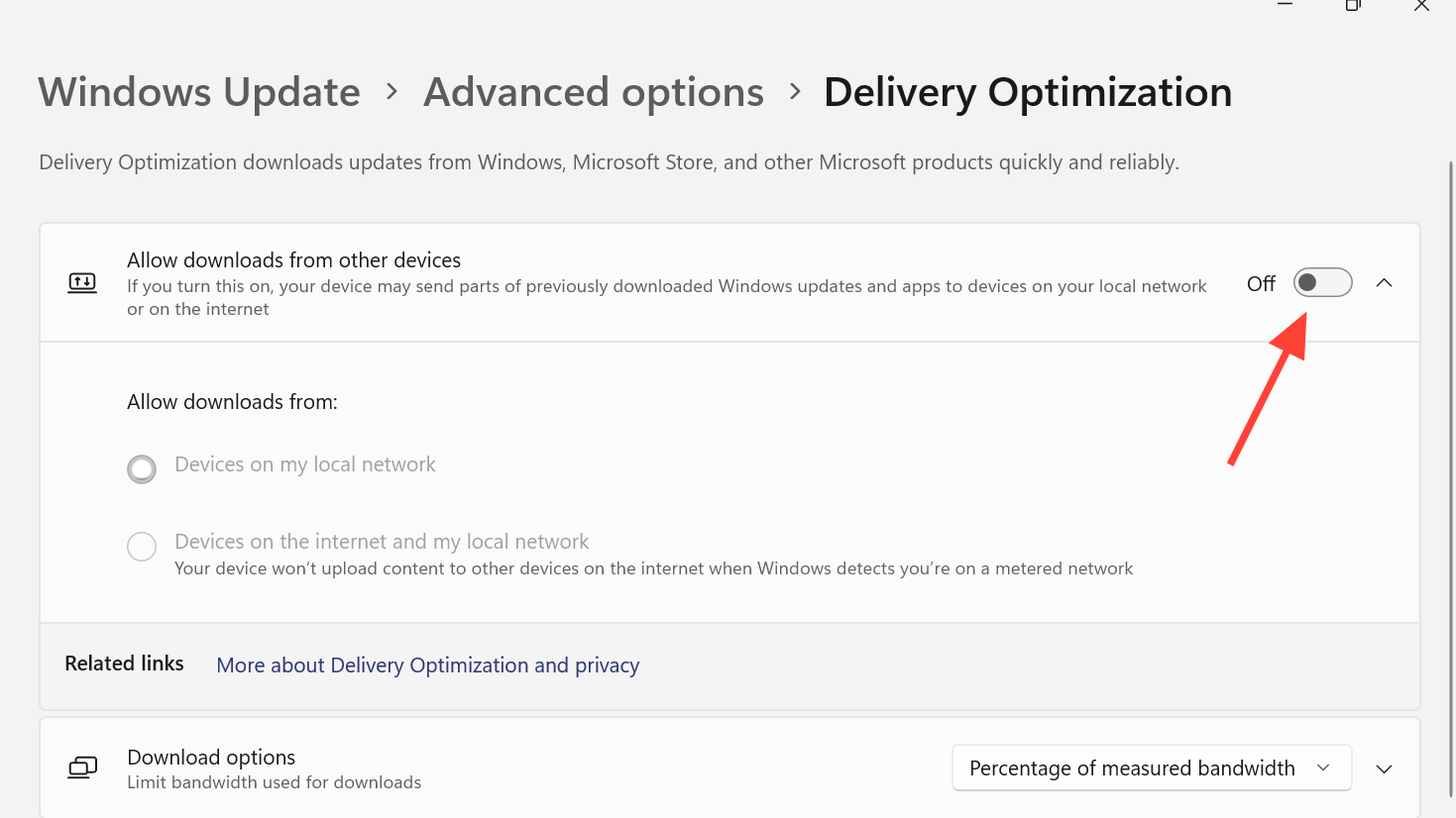 Step 3: Disable Windows peer-to-peer update sharing to free up bandwidth. In Settings > Update & Security > Windows Update > Advanced options > Delivery Optimization, turn off “Allow downloads from other PCs.”
