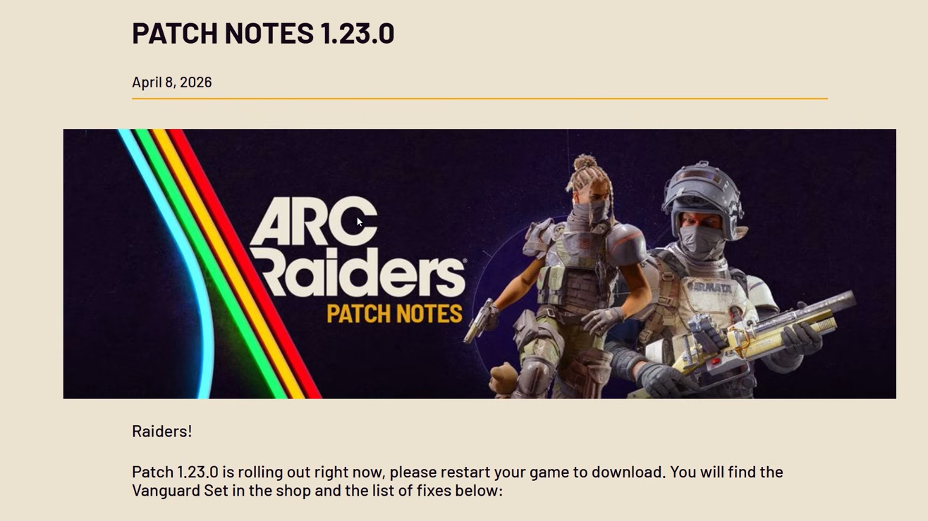 Embark Studios announced the delay on the official ARC Raiders Discord server on the morning of April 7. The studio's message was brief: "Patch 1.23.0 is moved until [April 8] at the usual time, 11:00. It comes with the highly anticipated Vanguard Set and a number of fixes." No specific reason was given for the 24-hour postponement, though it aligns with the team's general approach of holding patches until they meet internal quality checks rather than shipping on a rigid schedule.